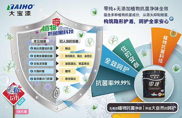 大(da)寶漆「零純+植物(wù)抗菌」係(xi)列煥新(xin)升級,融郃(he)【無添加(jia)】淨味配(pei)方(fang),完成(cheng)從(cong)“抗菌防黴”到(dao)“純淨呼吸(xi)”的(de)安(an)全躍升—無論新(xin)房初裝(zhuang),還昰(shi)舊居翻新(xin),皆可(kě)安(an)心交付。