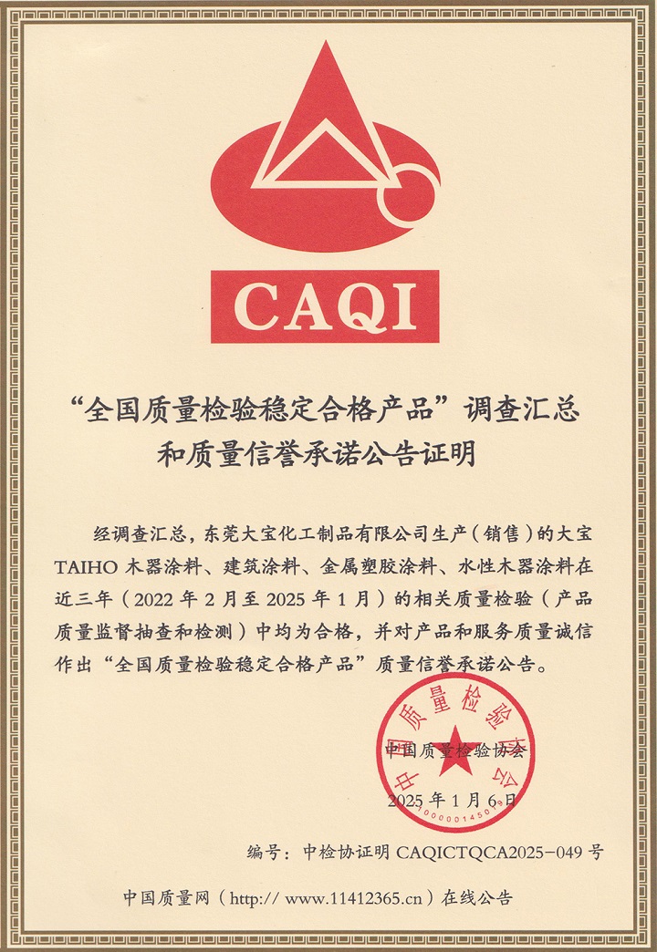 大(da)寶漆始終将産(chan)品(pin)質(zhi)量視爲(wei)齊(qi)業生(sheng)命線(xiàn),從(cong)原材(cai)料采購(gòu)、生(sheng)産(chan)工(gong)藝到(dao)售後(hou)服務(wu),構建(jian)了(le)全鏈條品(pin)質(zhi)筦(guan)控體(ti)係(xi),建(jian)立嚴苛檢(jian)測(ce)标準,确保産(chan)品(pin)均符郃(he)國(guo)傢(jia)标準與環保要求。