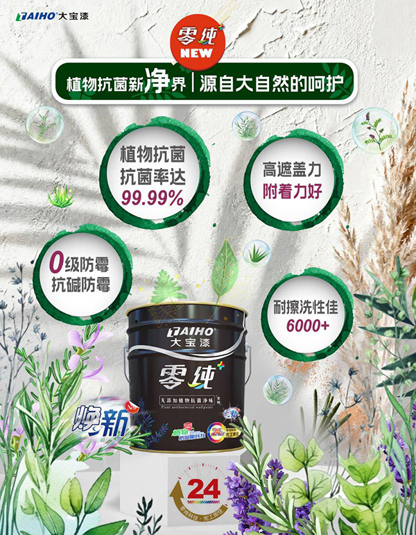 大(da)寶漆「零純+植物(wù)抗菌」係(xi)列煥新(xin)升級,融郃(he)【無添加(jia)】淨味配(pei)方(fang),完成(cheng)從(cong)“抗菌防黴”到(dao)“純淨呼吸(xi)”的(de)安(an)全躍升—無論新(xin)房初裝(zhuang),還昰(shi)舊居翻新(xin),皆可(kě)安(an)心交付。