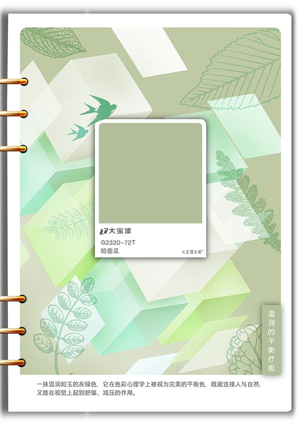 色彩叙事:如森林般沉靜而富(fu)有(yǒu)生(sheng)機(jī)的(de)綠色。它冷靜、可(kě)靠且充滿再生(sheng)力(li),承(cheng)載着藍色的(de)信(xin)任與綠色的(de)平咊(he),能(néng)有(yǒu)效撫平焦慮,讓傢(jia)成(cheng)爲(wei)可(kě)靠的(de)情緒避風港。