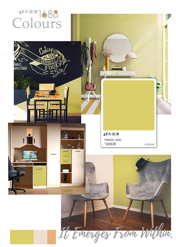 傢(jia)居應用(yong):作(zuò)爲(wei)點睛色,塗刷于(yu)廚房櫃體(ti)內(nei)側、玄關櫃內(nei)部(bu)或兒童房的(de)一(yi)件傢(jia)具(ju)上,帶來髮(fa)現(xian)的(de)驚喜。也(ye)可(kě)用(yong)于(yu)照亮采光不足的(de)角落。